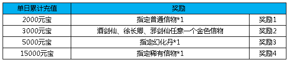 1、小王在活动期间单日累计充值2000元宝,可获得奖励【1】