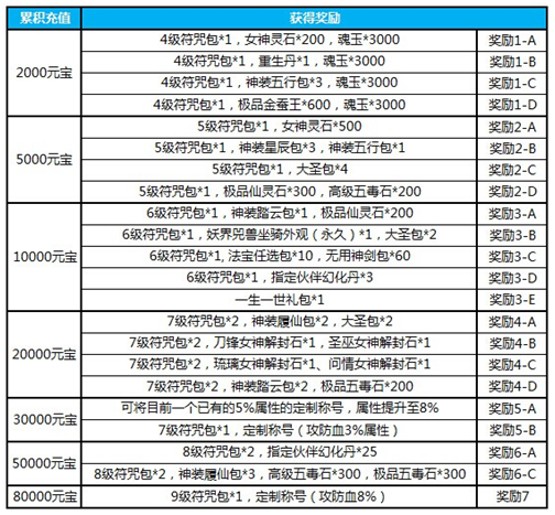 5)活动期间累计充值3000元宝,送高级幻化任选包*20,连携技升级石*20,刷新令*100,感恩大礼包*3