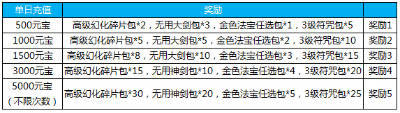 活动期间内当天累计充值达到2000元宝,即可获得特价礼包:阳符灵*3,4级符咒任选包*1,飞剑进阶丹*500,葫芦进阶丹*500