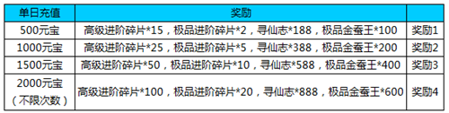 3、活动期间累计新增进阶值10000: 【极品】金蚕王*1、【中级】进阶碎片*3、伙伴卡牌*3、10魂玉包*3