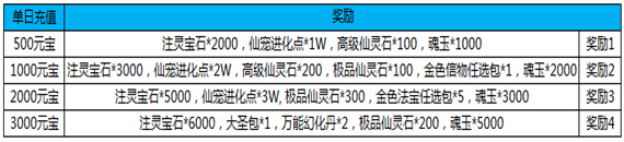 2、小刘在活动期间累计充值划账2000元宝,则可获得【奖励1】+【奖励2】+【奖励3】