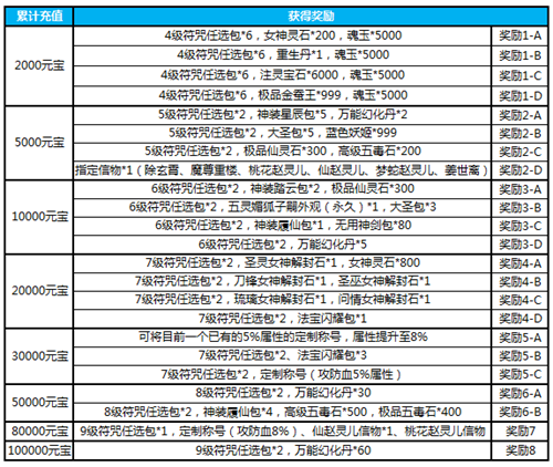 5、小伟在活动期间累计充值划账200000元宝,则可获得【奖励1】+【奖励2】+【奖励3】+【奖励4】+【奖励5】+【奖励6】+【奖励7】+【奖励8*2】