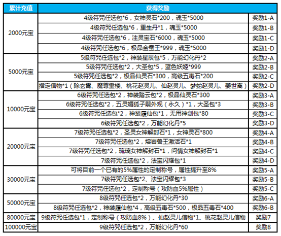 4)活动期间累计充值2500元宝,送3级符咒任选包*120,星璇信物*1,元旦大礼包*10