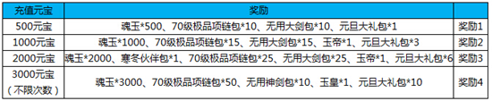 3、小于在活动期间累计充值划账2000元宝,则可获得【奖励1】+【奖励2】+【奖励3】
