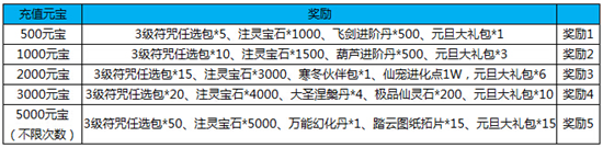 4)活动期间累计充值1000元宝,送魂玉*5000,神装星辰包*1,升星宝石*3888,高级幸运符*200,元旦大礼包*4