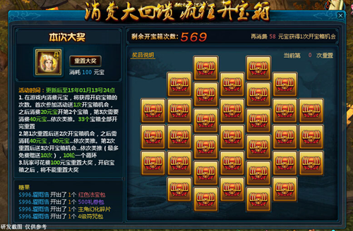 2)活动期间内玩家可花费100元宝重置大奖,开启宝箱后将无法重置大奖。