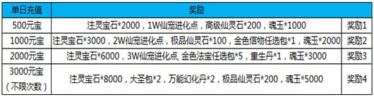 3、小于在活动期间累计充值划账2000元宝,则可获得【奖励1】+【奖励2】+【奖励3】