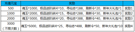 2)活动期间累计充值300元宝,送飞剑进阶丹*388,葫芦进阶丹*388,刷新令*10,问情大礼包*1,新年大礼包*1