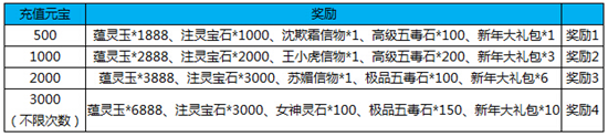 3、小于在活动期间累计充值划账2000元宝,则可获得【奖励1】+【奖励2】+【奖励3】