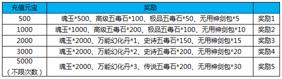 累计充值送魂玉、五毒石、无用神剑包等极品道具,小伙伴们千万不要错过哦!
