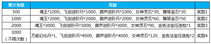 1)活动期间累计充值100元宝,送万能幻化丹碎片*6,女神灵石*30,金色法宝任选包*1,寻仙志*10