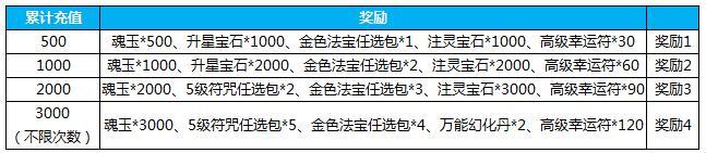 累计充值送海量魂玉、升星宝石、金色法宝任选包等极品道具,小伙伴们千万不要错过哦!