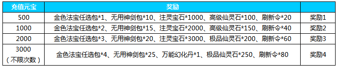 5.活动期间累计充值3000元宝,送3级符咒任选包*130,万能幻化丹*2,无用神剑包*20,花开大礼包*4