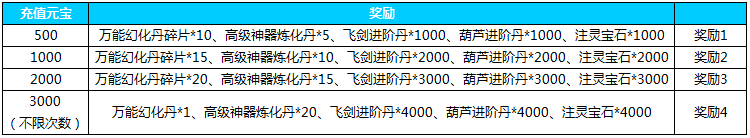 5.活动期间累计充值3000元宝,送万能幻化丹*2,女神灵石*350,送高级神器炼化丹*30,繁花大礼包*4