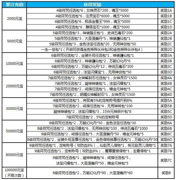 5、小伟在活动期间累计充值划账200000元宝,则可获得【奖励1】+【奖励2】+【奖励3】+【奖励4】+【奖励5】+【奖励6】+【奖励7】+【奖励8*2】