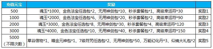 5)活动期间累计充值3000元宝,送注灵宝石*5000,极品进阶碎片*22,寻仙志*320,大圣涅槃丹*3,金色法宝任选包*15,似锦大礼包*4