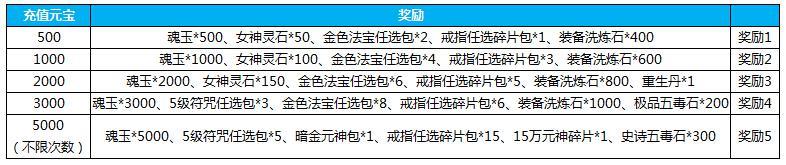 5.活动期间累计充值3000元宝,送万能幻化丹*2,女神灵石*350,送高级神器炼化丹*30,金色法宝任选包*10,春晖大礼包*4