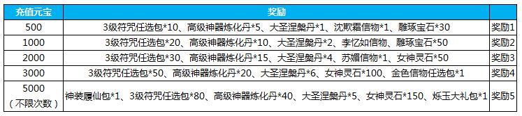 4.活动期间累计充值2500元宝,送魂玉*6000,万能幻化丹*2,极品进阶碎片*20,金色法宝随心任选包*1,橙色装备洗炼石*50,烁玉大礼包*2