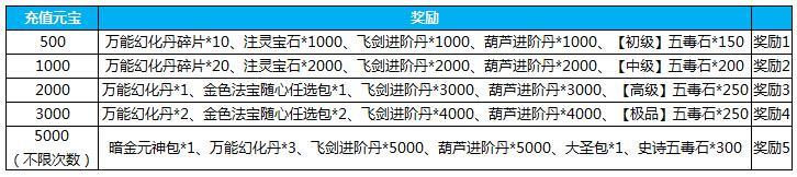 4.活动期间累计充值2500元宝,送3级符咒任选包*110,万能幻化丹*2,大圣包*2,大圣涅槃丹*2,橙色品质宝石*50,烁玉大礼包*2