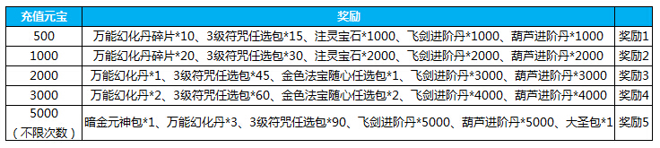 4.活动期间累计充值2500元宝,送魂玉*7000,万能幻化丹*3,极品进阶碎片*50,金色法宝随心任选包*1,橙色装备洗炼石*60,暑期大礼包*3