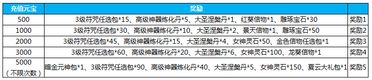 1、活动奖励3000元宝档次可以重复领取,其他均只能领取1次