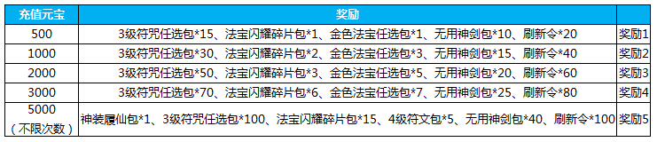 2.活动期间累计充值300元宝,送魂玉*2500,万能幻化丹*1,高级进阶碎片*50,无用神剑包*6,法宝闪耀碎片包*3,1级秘文任选包*10