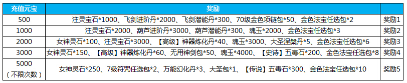 4.活动期间累计充值2500元宝,送注灵宝石*4000,极品进阶碎片*30,15星升星强化券*1,神装履仙包*1,2级秘文任选包*20,春秋大礼包*3