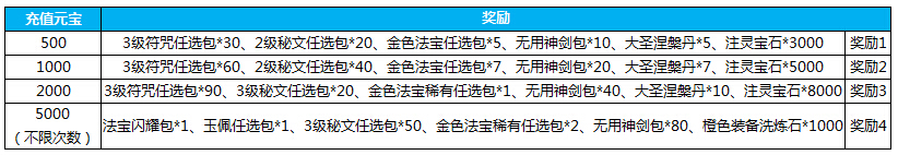1.活动期间累计充值100元宝,送3级符咒任选包*50,万能幻化丹碎片*20,极品任务卷轴*40,无用神剑包*4,1级秘文任选包*5