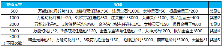 5.活动期间累计充值3000元宝,送万能幻化丹*4,女神灵石*400,送高级神器炼化丹*50,戒指任选碎片包*7,橙色装备洗炼石*70,霜降大礼包*5