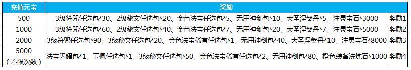 4.活动期间累计充值2500元宝,送秒杀套餐包*8,蕴灵玉*6000,3级符咒任选包*90,金色法宝随心任选包*1,橙色品质宝石*60,寒衣大礼包*3