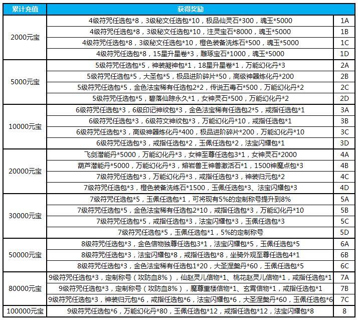 1.活动期间累计充值100元宝,送元灵喂养丹*80,万能幻化丹碎片*20,极品任务卷轴*40,无用神剑包*4,1级秘文任选包*5
