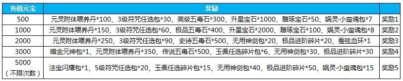 5.活动期间累计充值3000元宝,送元灵喂养丹*500,无用神剑包*30,高级神器炼化丹*50,法宝闪耀碎片包*7,3级秘文任选包*20,上元大礼包*5