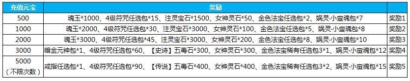 5.活动期间累计充值3000元宝,送元灵喂养丹*500,无用神剑包*30,高级神器炼化丹*50,法宝闪耀碎片包*7,3级秘文任选包*20,疏影大礼包*5