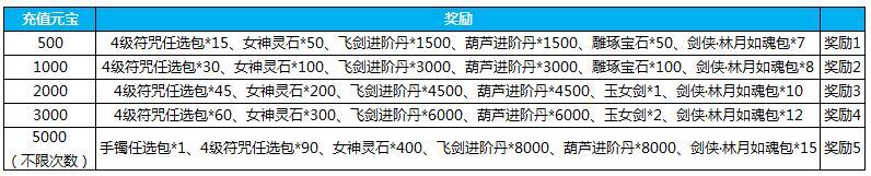 1.活动期间累计充值100元宝,送元灵喂养丹*80,无用神剑包*4,神器炼化丹*30,刷新令*40,2级秘文任选包*5