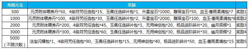 5.活动期间累计储值3000元宝,送飞剑进阶丹*2500,葫芦进阶丹*2500,无用神剑包*30,玉佩任选碎片包*5,3级秘文任选包*20,豪杰大礼包*5