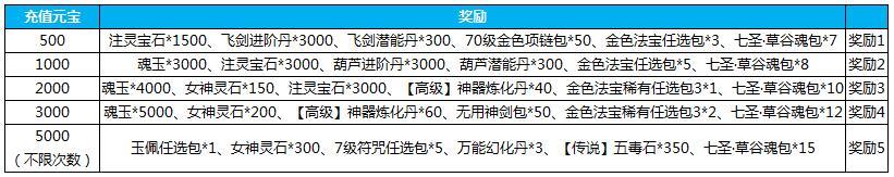 5.活动期间累计储值3000元宝,送3级符咒任选包*150,万能幻化丹*4,极品进阶碎片*70,法宝闪耀碎片包*7,3级秘文任选包*20,上清大礼包*5