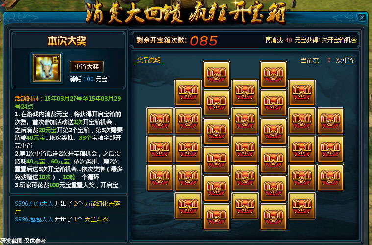 2)活动期间内玩家可花费100元宝重置大奖,开启宝箱后将无法重置大奖。