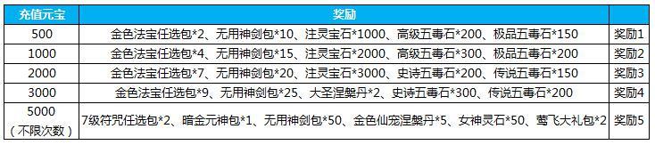 5)活动期间累计充值3000元宝,送传说五毒石*400,万能幻化丹*3,大圣涅槃丹*3,金色法宝任选包*15,莺飞大礼包*4