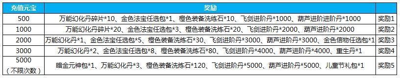 5.活动期间累计充值3000元宝,送注灵宝石*5000,高级神器炼化丹*30,大圣涅槃丹*4,戒指任选碎片包*5,娃娃机游戏币*60,儿童节礼包*4
