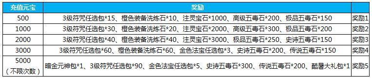 4、小伟在活动期间累计充值划账5000元宝,则可获得【奖励1】+【奖励2】+【奖励3】+【奖励4】+【奖励5】