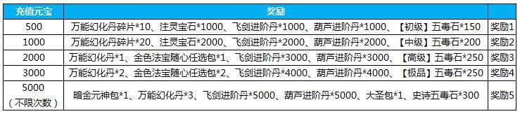 5.活动期间累计充值3000元宝,送秒杀套餐包*10,金色仙宠涅槃丹礼包*4,万能幻化丹*3,法宝闪耀碎片包*5,橙色装备洗炼石*60,流金大礼包*4