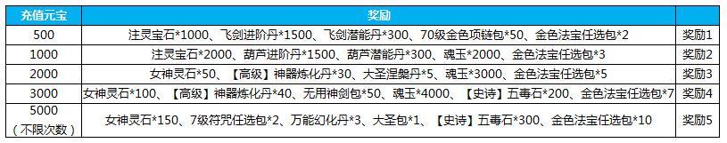 4.活动期间累计充值2500元宝,送秒杀套餐包*7,蕴灵玉*5888,3级符咒任选包*90,金色法宝随心任选包*1,橙色品质宝石*60,艳阳大礼包*2