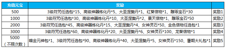 3、小于在活动期间累计充值划账3000元宝,则可获得【奖励1】+【奖励2】+【奖励3】