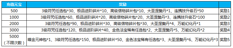 5.活动期间累计充值3000元宝,送万能幻化丹*4,女神灵石*400,送高级神器炼化丹*50,戒指任选碎片包*7,橙色装备洗炼石*70,国庆大礼包*5