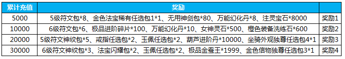 3、小于在活动期间累计充值划账20000元宝,则可获得【奖励1】+【奖励2】+【奖励3】