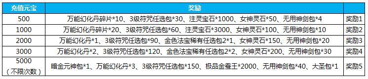 5.活动期间累计充值3000元宝,送万能幻化丹*4,女神灵石*400,送高级神器炼化丹*50,戒指任选碎片包*7,橙色装备洗炼石*70,金桂大礼包*5