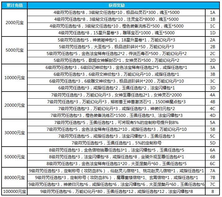 1.活动期间累计充值100元宝,送元灵喂养丹*50,万能幻化丹碎片*20,高级进阶碎片*30,无用神剑包*4,1级秘文任选包*5
