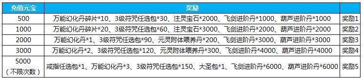 5.活动期间累计充值3000元宝,送万能幻化丹*4,女神灵石*400,送高级神器炼化丹*50,戒指任选碎片包*7,橙色装备洗炼石*70,下元大礼包*5