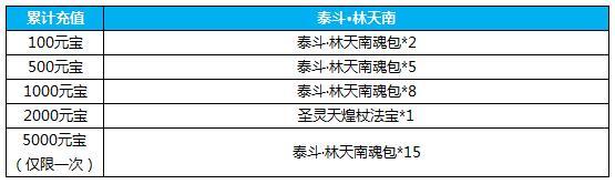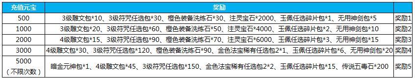 5.活动期间累计充值3000元宝,送元灵喂养丹*500,无用神剑包*30,高级神器炼化丹*50,法宝闪耀碎片包*7,3级秘文任选包*20,颛顼大礼包*5