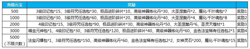 5.活动期间累计充值3000元宝,送飞剑进阶丹*2500,葫芦进阶丹*2500,无用神剑包*30,玉佩任选碎片包*5,3级秘文任选包*20,傲雪大礼包*5